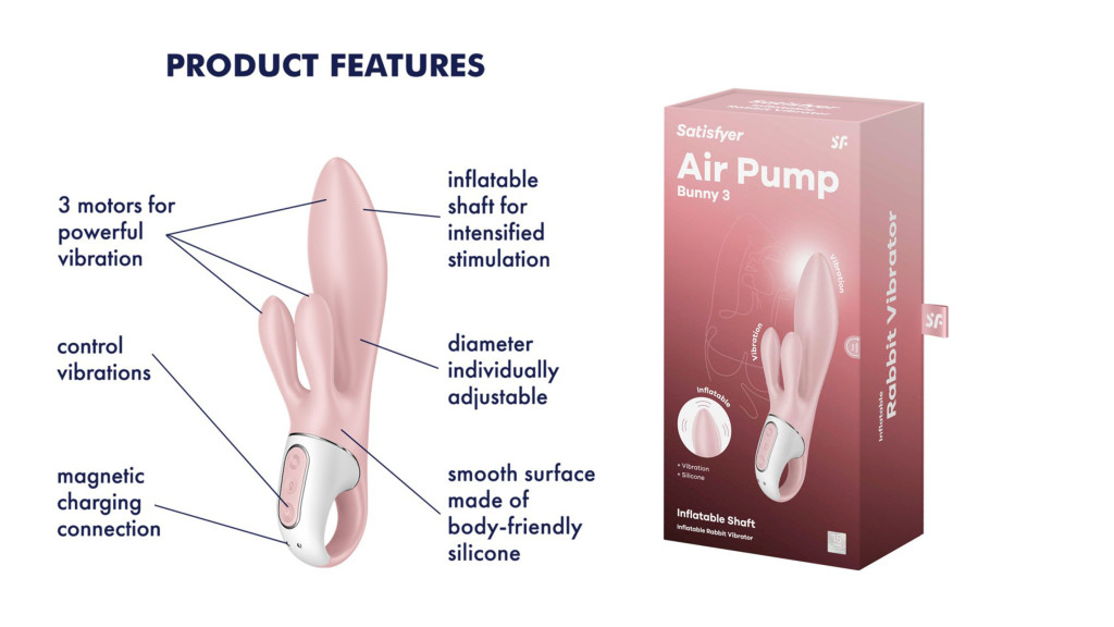 Az Air Pump Bunny egyik legnagyobb különlegessége a felfújható pumpás vibrátor állítható átmérővel, amely akár 15 mm-rel is növelhető. Ez lehetővé teszi, hogy teljes mértékben a saját igényeidhez igazítsd a teltségérzetet.