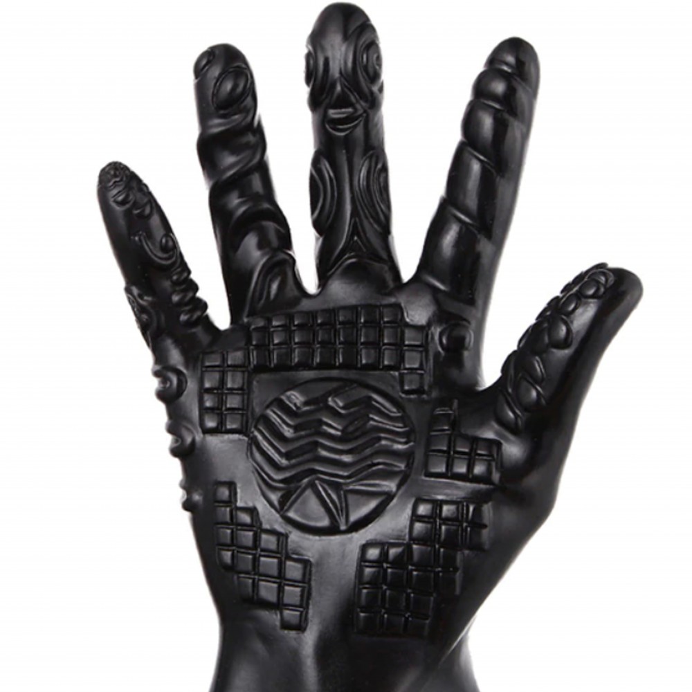 Öttujjas kesztyű, eltérő stimuláló felszínnel ellátott izgatásra javasolt erotikus játék.