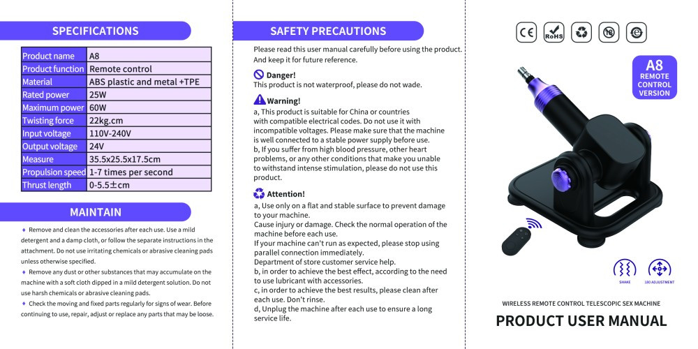 21 különböző rezgési frekvenciával működő, vezeték nélküli távirányítóval szabályozható, adapter segítségével csatlakoztatható szexgép. Tapadókorongja segítségével sík felületen rögzíthető. Részletes összeszerelési útmutató a dobozban található. A távirányító hatótávolsága 10 méter. A termék nem vízálló !